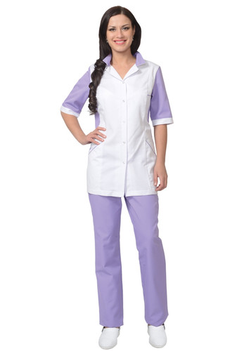 Костюм состоит из блузы и брюк. Блуза полуприлегающего силуэта, с центральной застёжкой на рубашечные кнопки. Воротник отложной с лацканами. На полочке расположены верхний накладной и нижние внутренние фигурные карманы. Рукава втачные, укороченные с манжетами. Детали блузы выполнены из отделочной ткани в цвет брюк. Брюки прямого силуэта, с застёжкой гульфика на тесьму «молния». Пояс притачной, застёгивающийся на петлю и пуговицу. Ширина пояса регулируется эластичной тесьмой в области боковых швов.