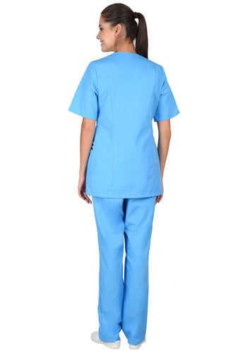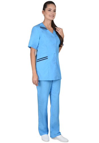 Костюм состоит из блузы и брюк. Блуза приталенного силуэта с застёжкой на пуговицы, короткими рукавами, с отделкой по воротнику и нижним карманам. Брюки прямого покроя без карманов с притачным поясом стянутым резинкой.