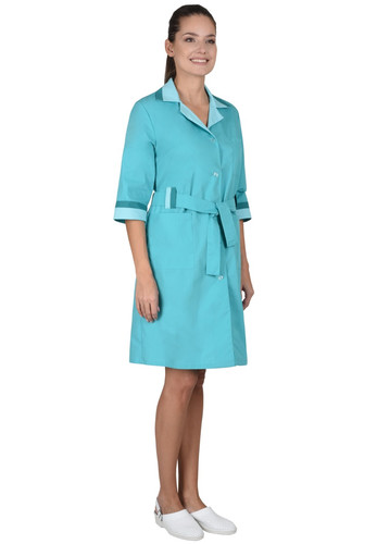 Халат прямого силуэта с центральной бортовой застежкой на пуговицы, с отложным лацканом и воротником. По линии талии проходит пояс, завязывающийся спереди. Воротник, манжеты, шлёвки из отделочной ткани.