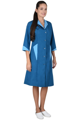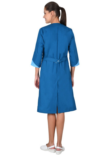 Халат полуприлегающего силуэта, слегка расширенный к низу. Застёжка на пуговицы, рельефы. Воротник, часть нижних карманов и низ рукавов 3/4 из отделочной ткани.