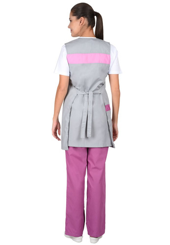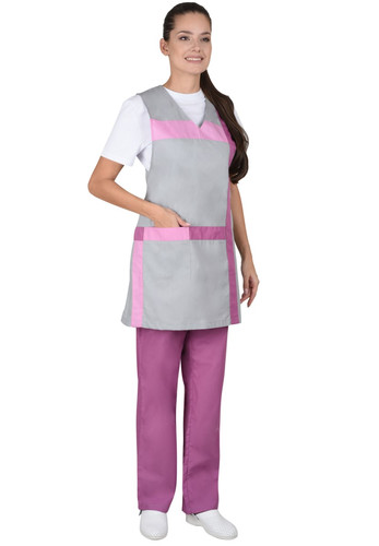 Комплект женский комбинированный , трехцветный, состоит из фартука-сарафана и брюк. Фартук-сарафан с V-образным вырезом горловины и прямой линией низа, с боковыми завязками на полочке и резинкой и пуговицей на спинке для регулировки объема по талии, с накладным карманом на правой половинке полочки. Брюки прямые, без застежки, с притачным поясом, частично стянутым резинкой и с накладными боковыми карманами.