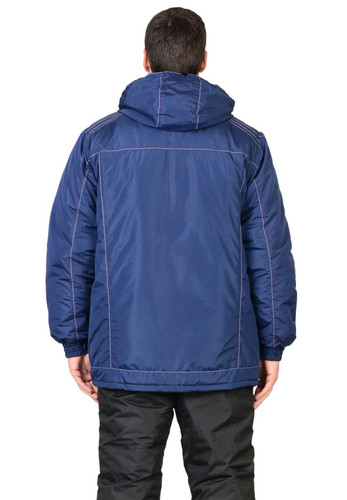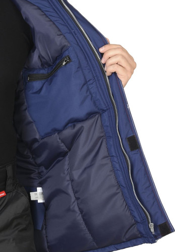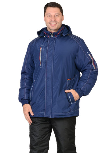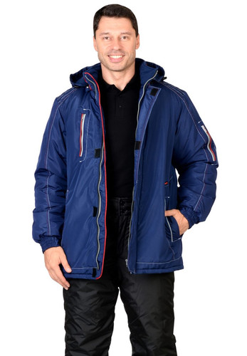 Куртка длинная, прямого силуэта, с притачной утепл.нной подкладкой и пристегивающимся капюшоном; воротником-стойкой; с кокеткой расстрочной нитками контрастного цвета; ветрозащитной планкой застегивающиеся на ленту «контакт»; подпланкой; с центральной заст.жкой на тесьму - «молния»; с верхним прорезными карманом с правой стороны на тесьму – «молния»; с нижними прорезными карманами в листочку; рукава втачные с манжетами частично стянутыми на резинку, на левом рукаве выполнен карман на тесьму – «молния», с внутренним карманом на тесьму – «молния». В куртке вшивается бордовый и СВ кант.