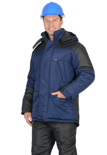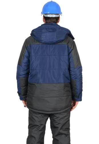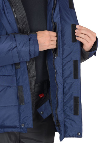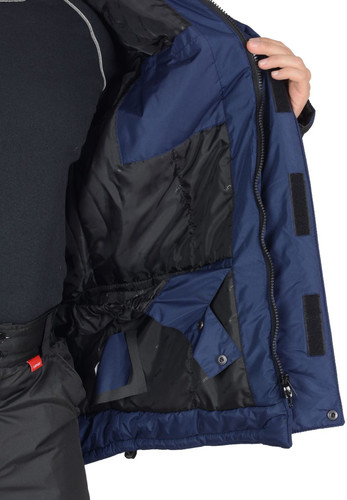 Куртка прямого силуэта; с горизонтальными строчками настрачивания слоя утеплителя на детали полочек, спинки, рукавов; воротник - «стойка»; с тесьмой «молния» по горловине, скрытой под планкой, для пристёгивания капюшона; с центральной бортовой застёжкой на двухзамковую тесьму «молния» и двумя внешними ветрозащитными клапанами, застёгивающимися на 4 текстильные застёжки «липучки» длиной 9,5см и одну кнопку, по низу планки; с внутренним ветрозащитным клапаном правой полочки (от верхнего края воротника до низа куртки), из ткани подкладка.