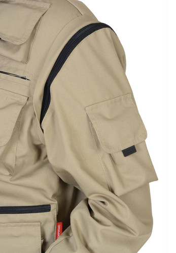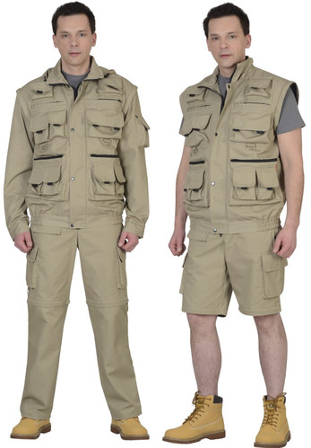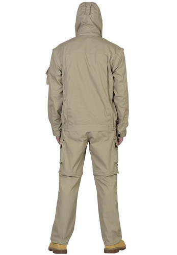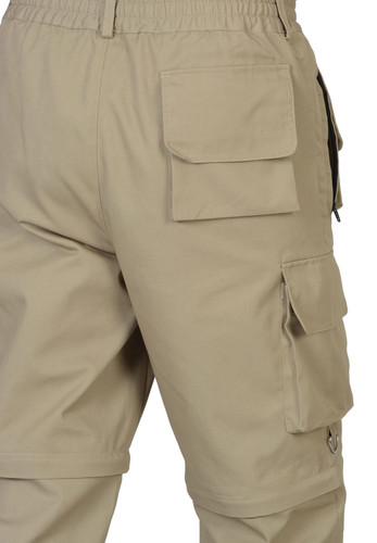 Брюки прямые с притачным поясом с 5-ю шлёвками, частично стянутый резинкой, застёгивающийся на пуговицу, застёжка гульфика на тесьму - "молния", с различными многофункциональными карманами. Низ брюк отстёгивается для трансформации брюк в шорты.