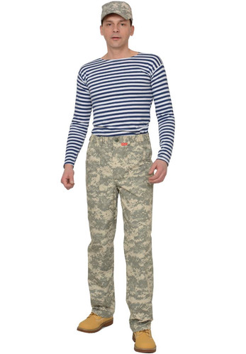 Брюки с притачным поясом, заст.гивающимся на пуговицу; с 5 шлевками и эластичной тесьмой по боковым швам брюк; с застежкой гульфика на три петли и пуговицы; с двумя накладными боковыми карманами с наклонным входом.