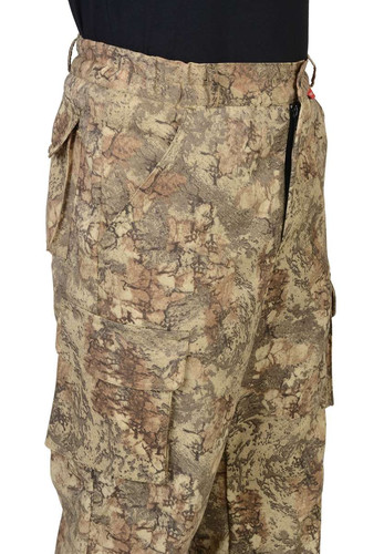 Брюки с притачным поясом, частично стянутым резинкой и застёгивающимся на пуговицу, застёжкой гульфика на молнию, с различными карманами. Низ брюк регулируется эластичным шнуром.Ткань смесовая с ВО пропиткой.