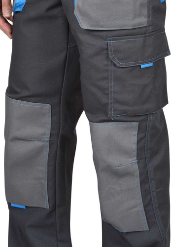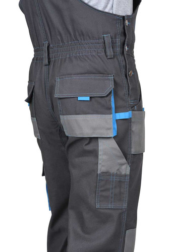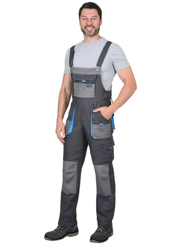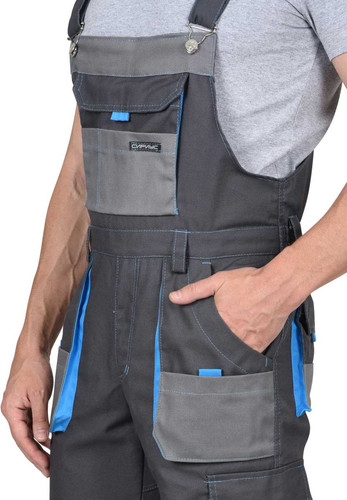 Полукомбинезон выполнен из ткани «Панакота Комфорт», с застежкой гульфика на молнию, застежкой в боковом шве на пуговицы, накладным объемным комбинированным карманом на нагруднике с фигурным клапаном, застегивающимся на липучку. Изделие с нижними боковыми накладными комбинированными объемными карманами с наклонным входом, с накладным объемным карманом и фигурным клапаном на правом боковом шве, застегивающимся на липучку, с объемными наколенниками, с задними накладными объемными карманами и комбинированным карманом для инструмента. В области талии по всей ширине с изнаночной стороны вставлена резинка для лучшего прилегания.