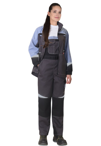 Полукомбинезон трёхцветный, с застёжкой в левом боковом шве на 3 петли и 3 пуговицы. Полукомбинезон с внутренними боковыми карманами и с тремя накладными карманами: нагрудным, задним и на левом боковом шве. Полукомбинезон с бретелями, длина которых регулируется резинкой и фастексами. Понизу шагового шва усилительные накладки на передних и задних половинках