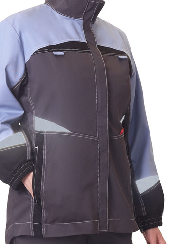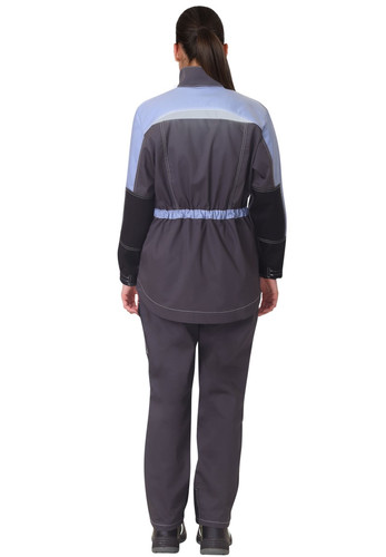 Куртка трёхцветная удлиненная, прямого силуэта, с воротником стойка, с центральной застёжкой на молнию до края воротника, накрытую ветрозащитной планкой, с нижними боковыми карманами в рельефных швах, с кулисой на спинке в области талии, линия низа спинки фигурная. Рукава с притачными манжетами, с частичной стяжкой на резинку ткацкую.