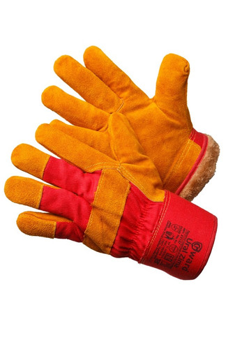 Спилковые комбинированные перчатки. Перчатки сшиты из спилка КРС темно-оранжевого цвета и плотной ткани красного цвета, прошиты прочными нитями, утеплены искусственным мехом типа "мутон". Дополнительные накладки в районе ногтевых пластин и костяшек тыльной стороны ладони защищают эти места от травм.