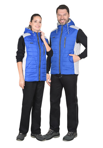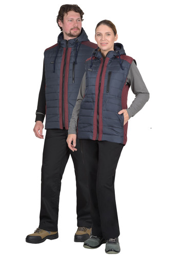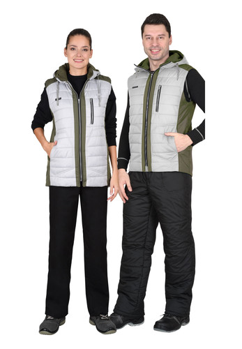 Жилет с капюшоном, комбинированный из двух цветов, центральные части переда и спинки простеганы вместе с утеплителем. Застежка жилета на молнию, спинка понизу фигурная удлиненная. Левый нагрудный прорезной карман на молнию, нижние карманы в швах. На подкладке с правой стороны накладной карман на молнию.
