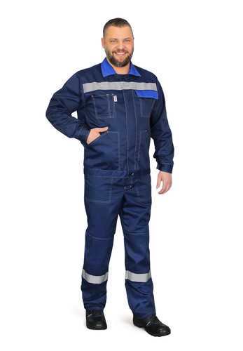 Полукомбинезон с регулируемыми бретелями с застежкой на фастексы. По талии спинки - резинка. Объём полукомбинезона регулируется при помощи пуговиц, расположенных с правой стороны. Имеется один центральный карман с клапаном и боковые карманы с косым входом. По нижней части полукомбинезона расположена световозвращающая лента шириной 50 мм. В области коленей имеются усиления.