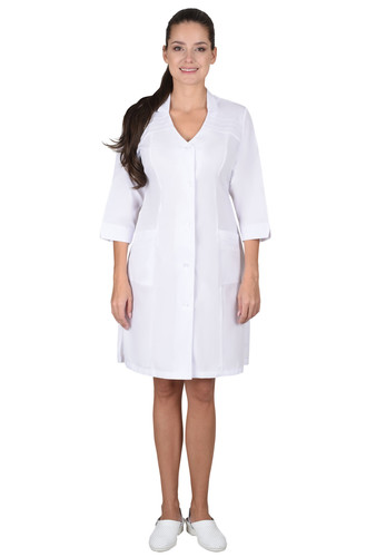 Укороченный халат полуприлегающего силуэта. Особенность модели-декоративные защипы по кокеткам и на карманах. Воротник-стойка. Рукава 3/4 с фигурным разрезом.