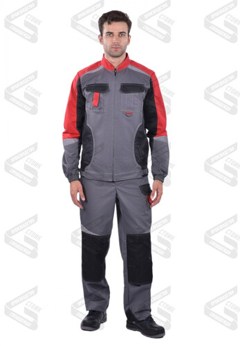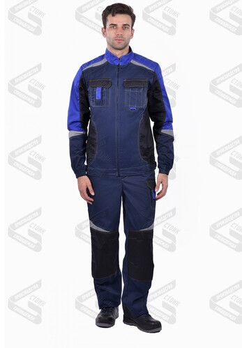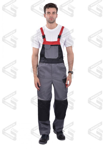 Полукомбинезон: в правом боковом шве застежка на пуговицу, в среднем шве на «молнию», карман с клапаном на грудке, боковые карманы с отрезным бочком. Колени усилены накладками, заложены по 2 вытачки. Один карман над левым наколенником. По шву наколенников косые, фигурные вставки СОП.
