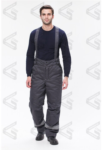Брюки прямого кроя, с застежкой гульфика на молнию, притачным поясом, застегивающимся на пуговицы, со шлёвками и съемными бретелями.