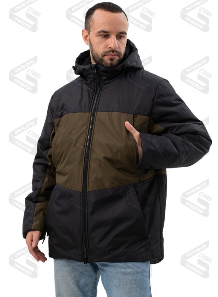 Куртка мужская демисезонная из ткани Дюспо с утеплённой подкладкой из синтепона плотностью 200 г/м². Прямой силуэт, воротник стойка, капюшон несъемный. Карманы: 2 прорезных на груди и 2 на нижней части закрытые клапаном.