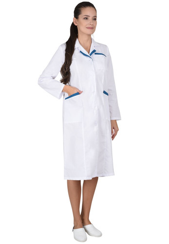 Халат с вертикальными рельефами, центральной бортовой застежкой на пуговицы. Английский воротник с отделкой из ткани контрастного цвета. Рукав длинный. Объем по талии регулируется хлястиком.