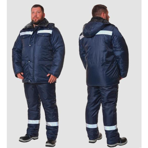 Костюм состоит из куртки и полукомбинезона. Рекомендуется для защиты от пониженных температур для рабочих специальностей, сопровождающихся сильным загрязнением рабочей одежды. Куртка со светоотражающими полосами, с центральной бортовой застежкой на молнию, с ветрозащитным клапаном на кнопках. Вместительные утепленные нагрудные и боковые карманы защищены клапанами на кнопках. Рукав прямой с трикотажной манжетой. Куртка с меховым воротником и съемным капюшоном на кнопках. Объем талии регулируется кулисой со шнуром. Полукомбинезон с центральной застежкой на молнию и регулируемыми бретелями. По низу брюк проходит широкая светоотражающая полоса.