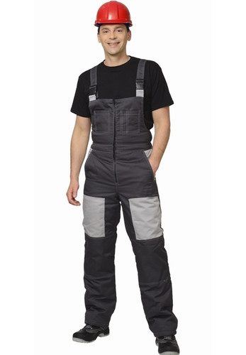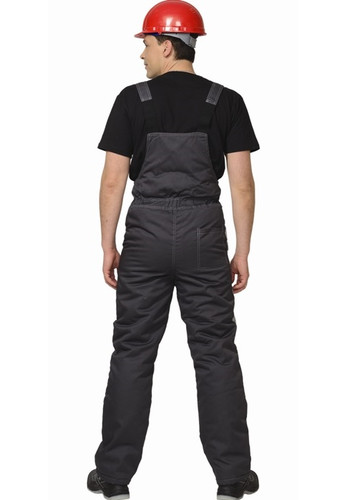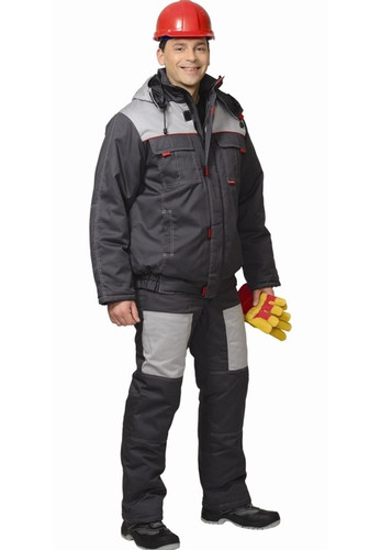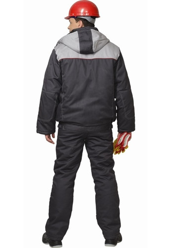 Костюм состоит из короткой куртки и полукомбинезона тёмно-серого с серым цвета, от пониженных температур Утеплитель: синтепон 360 г/м²
