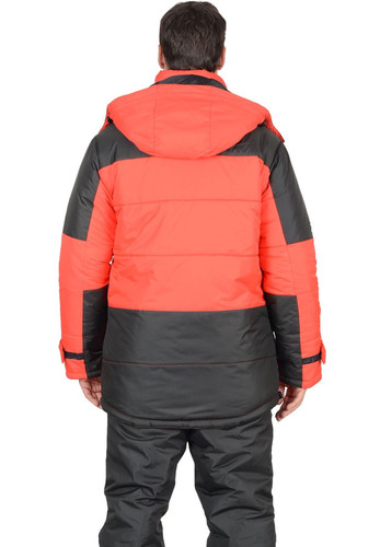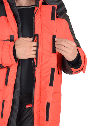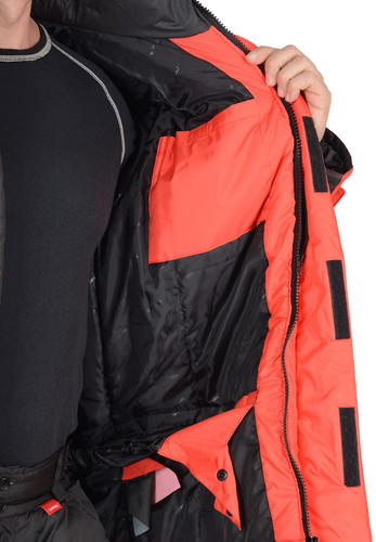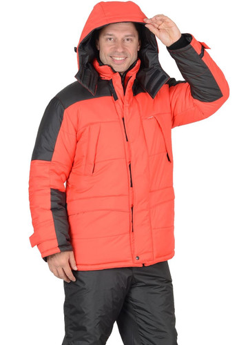 Куртка прямого силуэта; с горизонтальными строчками настрачивания слоя утеплителя на детали полочек, спинки, рукавов; воротник - «стойка»; с тесьмой «молния» по горловине, скрытой под планкой, для пристёгивания капюшона; с центральной бортовой застёжкой на двухзамковую тесьму «молния» и двумя внешними ветрозащитными клапанами, застёгивающимися на 4 текстильные застёжки «липучки» длиной 9,5см и одну кнопку, по низу планки; с внутренним ветрозащитным клапаном правой полочки (от верхнего края воротника до низа куртки), из ткани подкладка.