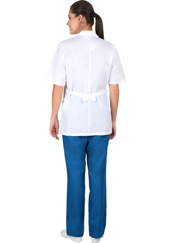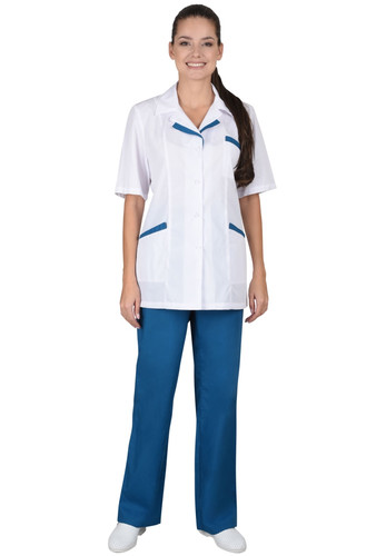 Костюм состоит из блузы и брюк. Блуза прямого силуэта с фигурной отделкой на лацканах и карманах. Ширина по линии талии регулируется хлястиком. Брюки свободного покроя на резинке.