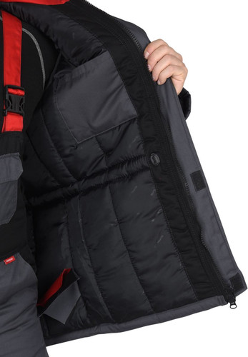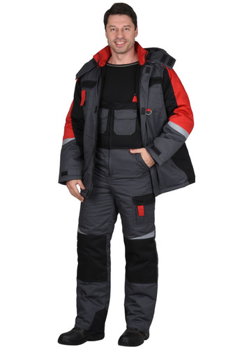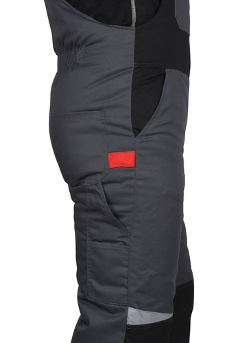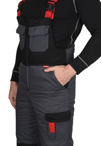 Полукомбинезон с притачной утеплённой подкладкой, с центральной потайной застёжкой на 2-х замковую тесьму "молнию", верхними накладными карманами с клапаном и нижними внутренними боковыми карманами, с наколенниками, с многофункциональным накладным карманом на левом боковом шве с клапаном и патой на ленте "контакт". На задней правой половинке один верхний и 2 нижних кармана для инструмента, настроченные один на другой, также предусмотрена шлёвка для инструмента.