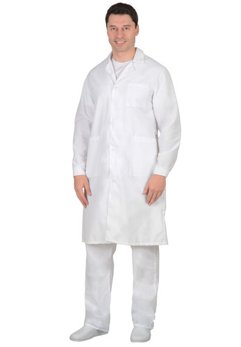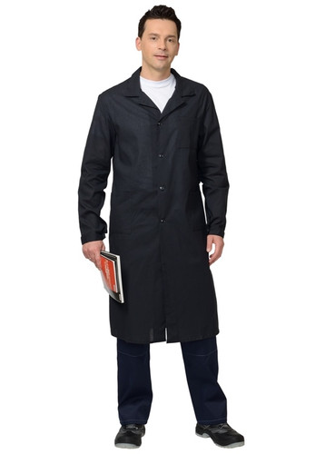 Отложной воротник, застёжка на пуговицы, два кармана. Манжеты рукавов на пуговице. По талии спинки - хлястик. ГОСТ 12.4132-83.
