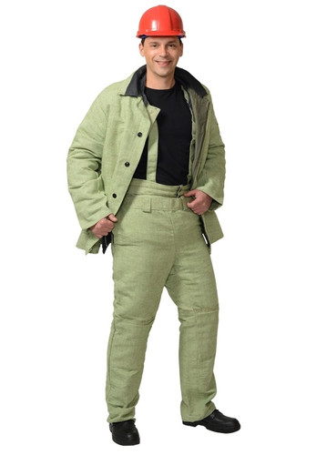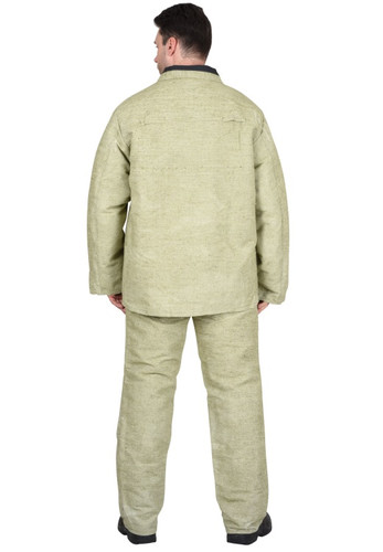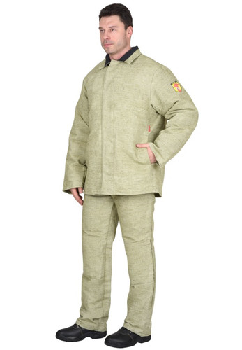 Костюм для проведения сварочных работ, состоит из куртки и брюк. Куртка с центральной потайной бортовой застежкой на пуговицы и карманами в боковых швах. На спинке кокетки и под проймами рукавов, вентиляционные отверстия. Воротник отделан хлопчатобумажной тканью для более комфортного ношения. Брюки с откидывающейся передней частью, задние половинки с притачным поясом, застегивающимся спереди, с карманами в боковых застежках брюк. Утеплитель ватин, отстегивающийся.