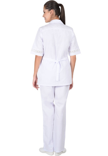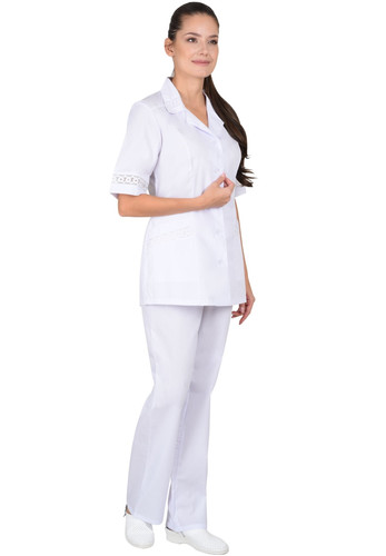Блуза полуприлегающего силуэта, с центральной бортовой застежкой на 5 петель и 5 пуговиц, с отложным воротником, с рельефными швами на полочках, с нижними карманами. Рукава короткие. Воротник, карманы, рукава с ажурной отделкой. Ширина блузы по талии регулируется хлястиком. Брюки прямые, с притачным поясом, частично стянутым эластичной лентой по боковым сторонам. Тк. смесовая, 65%-п/э, 35%-х/б, 120 г/кв.м.