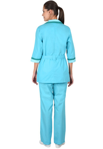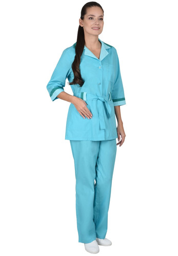 Костюм состоит из блузы и брюк. Блуза прямого силуэта с центральной застежкой на пуговицах с отложными лацканами и воротником, с поясом, карманами. Воротник, манжеты, шлёвки из отделочной ткани. Брюки прямые с притачным поясом, частично стянутым резинкой.