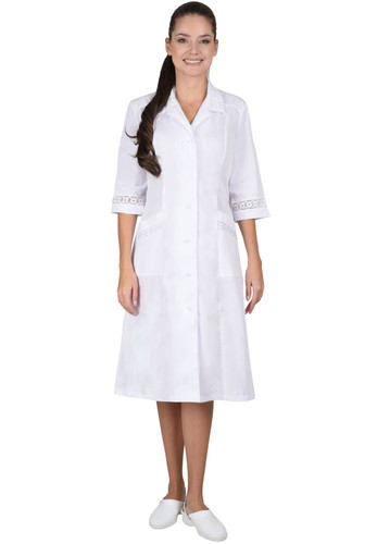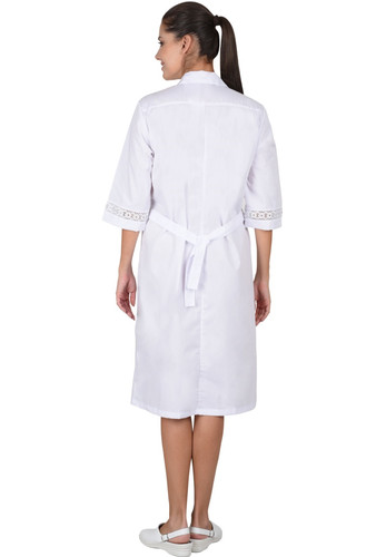 Тк. смесовая, 65%-п/э, 35%-х/б, 120 г/кв.м. Халат полуприлегающего силуэта, с центральной застёжкой на 5 петель и пуговицы, с отложным воротником, с нижними накладными карманами с фигурными планками. Рукава 3/4. Воротник, карманы, рукава с ажурной отделкой. По талии халат регулируется поясом ГОСТ 12.4.131-83