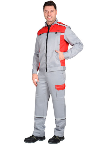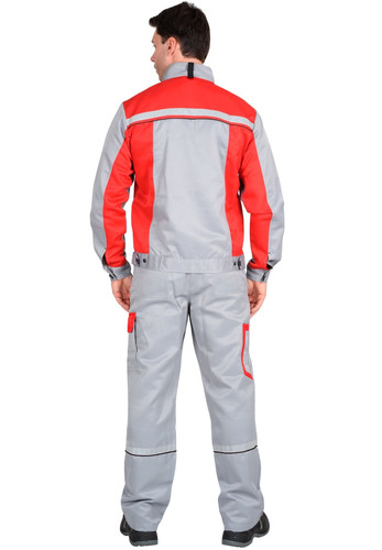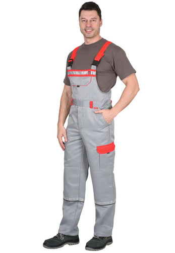 Полукомбинезон с застёжкой гульфика и застёжкой в правом боковом шве на три петли и пуговицы, верхним накладным карманом и нижними внутренними боковыми карманами, с наколенниками, с накладным карманом на левом боковом шве с клапаном на кнопке с патой, с двумя задними и карманами для инструментов, по спинке вставлена резинка.