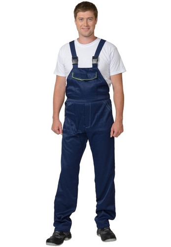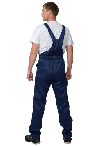 Полукомбинезон с застежкой гульфика и бокового шва на пуговицы, нагрудным и боковыми накладными карманами, с эластичной лентой по спинке, задними карманами и шлевкой для инструмента. Бретели регулируется при помощи скрытой эластичной ленты и фастексов.