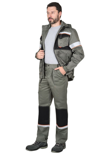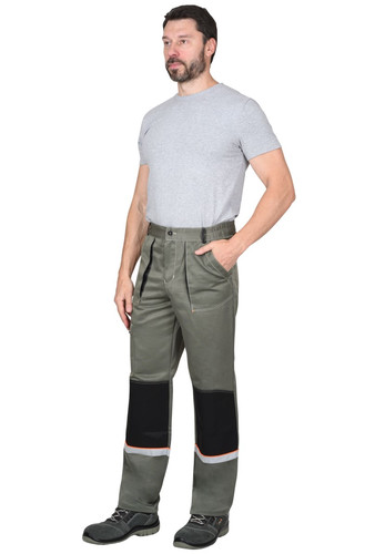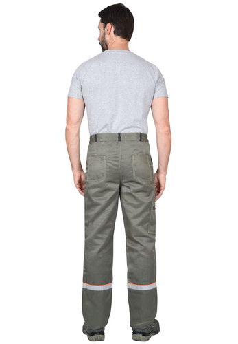 Брюки прямые, на притачном поясе с резинкой ткацкой, застёгивающиеся на одну обметанную петлю и пуговицу, с 5-ю шлевками, с застёжкой гульфик на тесьму «молния», с накладными боковыми и задними карманами и карманом на правом боковым шве, с наколенниками. В брюках предусмотрен кант готовый д.3мм контрастного цвета и ленты светоотражающей СОП (мелкодисперсной белой) ш.25мм для обозначения сигнальной видимости.