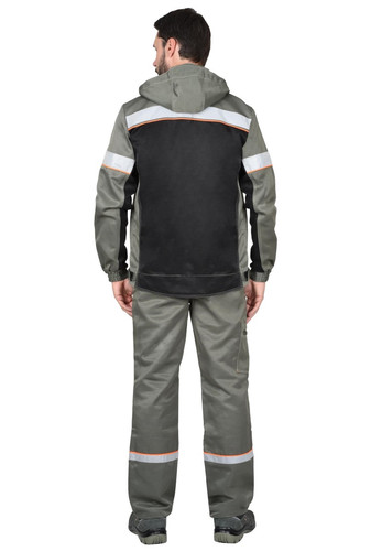 Куртка прямого силуэта, укороченная с удлиненной фигурной спинкой, с центральной застёжкой на тесьму - «молния» однозамковую до верха, с подпланкой, воротником стойка, с пристёгивающимся капюшоном на тесьму «молния», верхними и нижними карманами. Ширина куртки понизу регулируется хлястиком с лентой «контакт». С втачными рукавами и притачной манжетой понизу с частичной стяжкой на резинку ткацкую. В куртке предусмотрен кант готовый д.3мм контрастного цвета и ленты светоотражающей СОП (мелкодисперсной белой) ш.25мм и 50мм для обозначения сигнальной видимости.