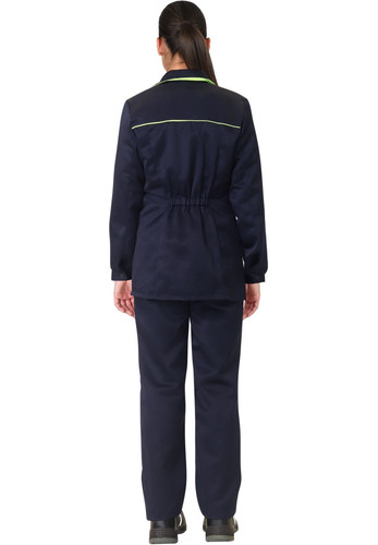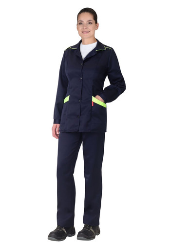 Куртка длинная, с центральной бортовой застежкой на пять петель и 5 пуговиц; с отложным воротником, с нижними накладными карманами. Рукава втачные с манжетами на пуговицах. По средней части спинки в области талии проложена кулиска с эластичной тесьмой для прилегания.
