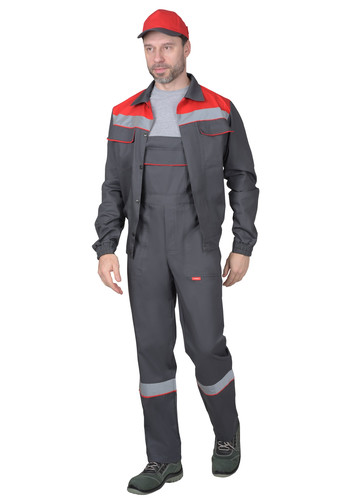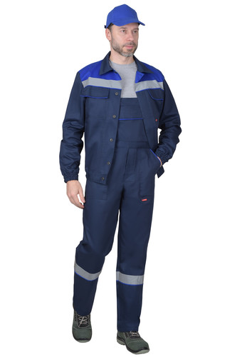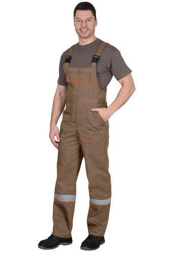 Полукомбинезон прямого покроя, с застёжкой гульфика и застёжкой в правом боковом шве на три петли и пуговицы, с карманом и клапаном на нагруднике, с боковыми накладными карманами, с карманами для инструментов. По низу полукомбинезона предусмотрена Лента светоотражающая шириной 50мм. для обозначения сигнальной видимости.